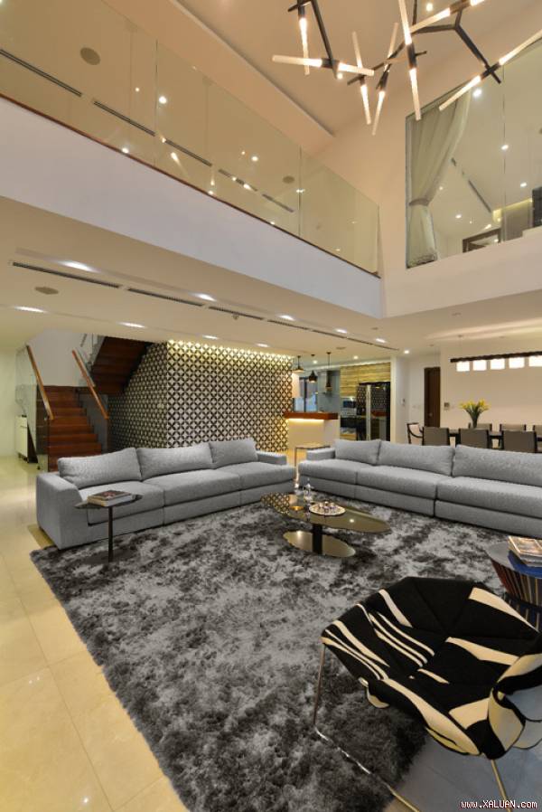 Với tiêu chí đơn giản nhưng sang trọng, nhà được thiết kế với các đường nét tối giản, sử dụng các mảng lớn. Đá tự nhiên được sử dụng ốp toàn bộ mảng tường thông tầng kéo dài từ phòng khách ra sảnh, tạo sự liên kết giữa hai tầng.
