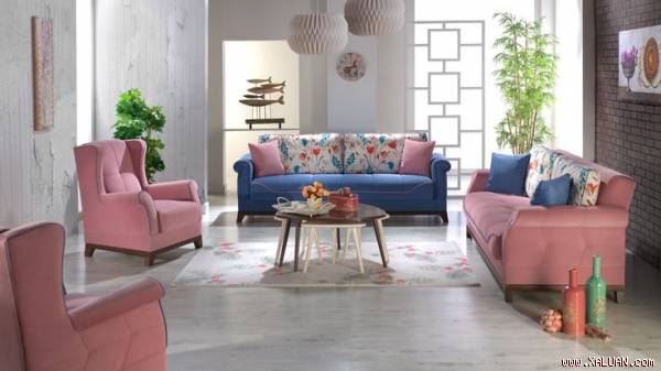 Bộ sofa màu hồng dịu dàng kết hợp mảng tường sơn màu xanh da trời yên bình