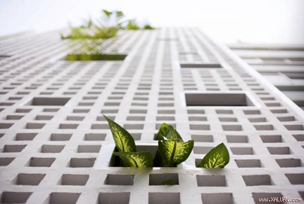 Cùng với tổ chức không gian cũng như các chiến lược sinh thái, một trong những tính năng rất đặc biệt mà tạo ra sự khác biệt hoàn toàn của ngôi nhà với hàng xóm xung quanh là bức màn trắng ở phía mặt tiền. Bức màn này được xây dựng với các khối xi măng, khung thép bao phủ toàn bộ phía ngoài. Với thiết kế ô rỗng, nó giúp bảo vệ ngôi nhà khỏi sự dòm ngó của kẻ trộm, mà vẫn thông gió, chiếu sáng được từ ngoài vào trong. Vào ban đêm, mặt tiền đã được bật sáng đèn từ bên trong, nổi bật so những ngôi nhà khác trong hẻm.
